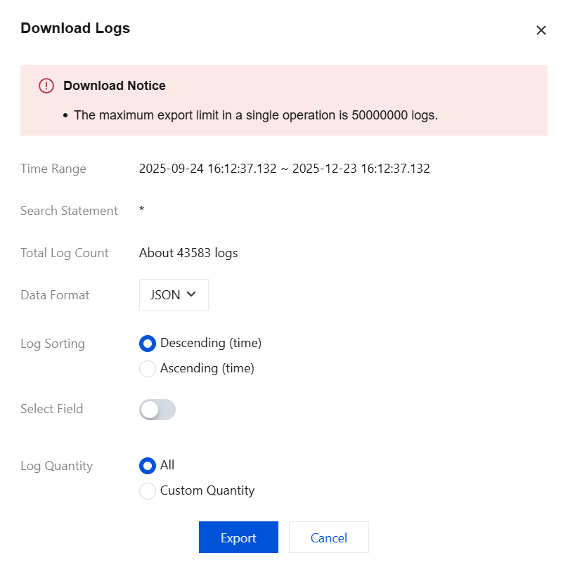 A maximum of 1 million logs can be downloaded in a single task. If you need to download more than 1 million logs, it is recommended to split the download into multiple tasks.