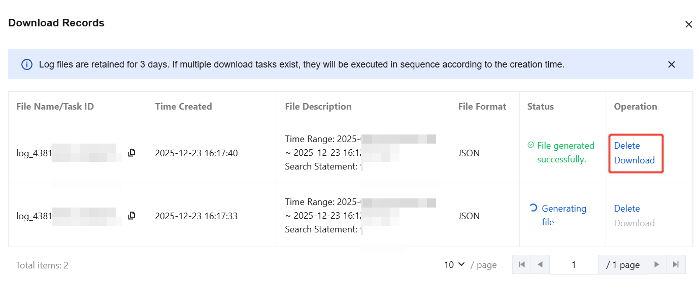 Successfully created tasks for downloading logs are retained for 3 days. Log files will be deleted after 3 days. Please download them in a timely manner.