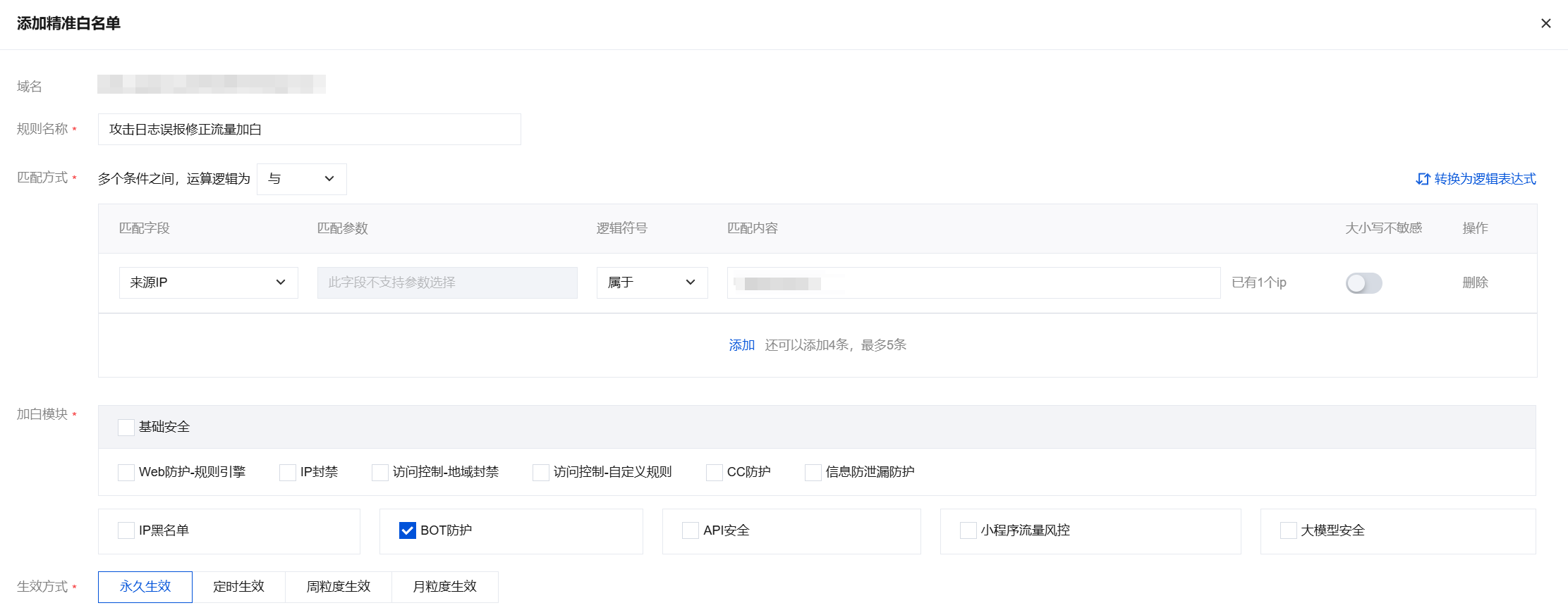 误报修正:支持一键添加对应防护模块的精准白名单规则,不再拦截对应 IP 访问,完成修改后,单击确定