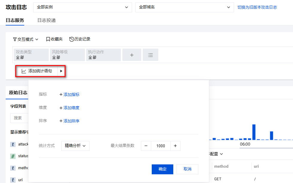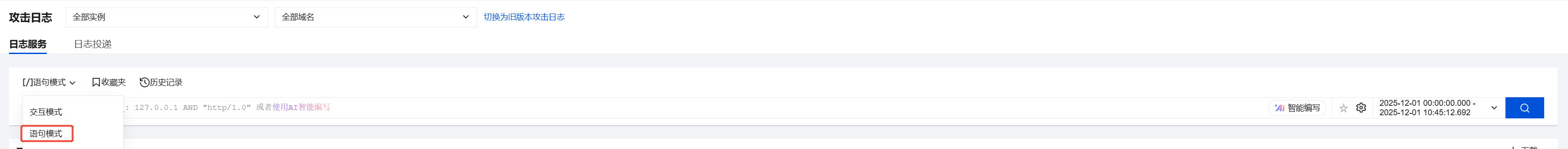 a. 在攻击日志 > 日志服务页面,选择语句模式