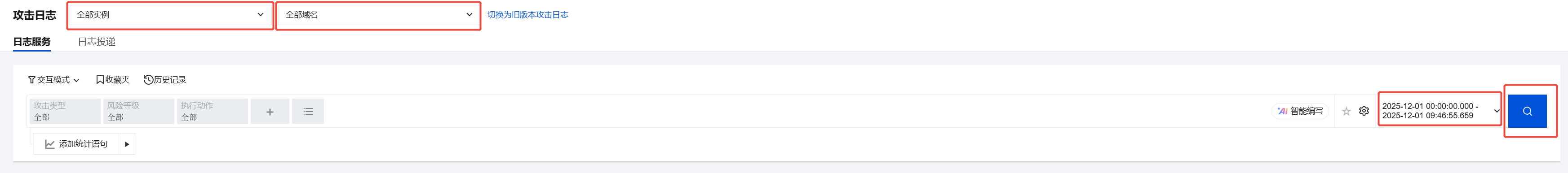a. 在攻击日志 > 日志服务页面,选择交互模式