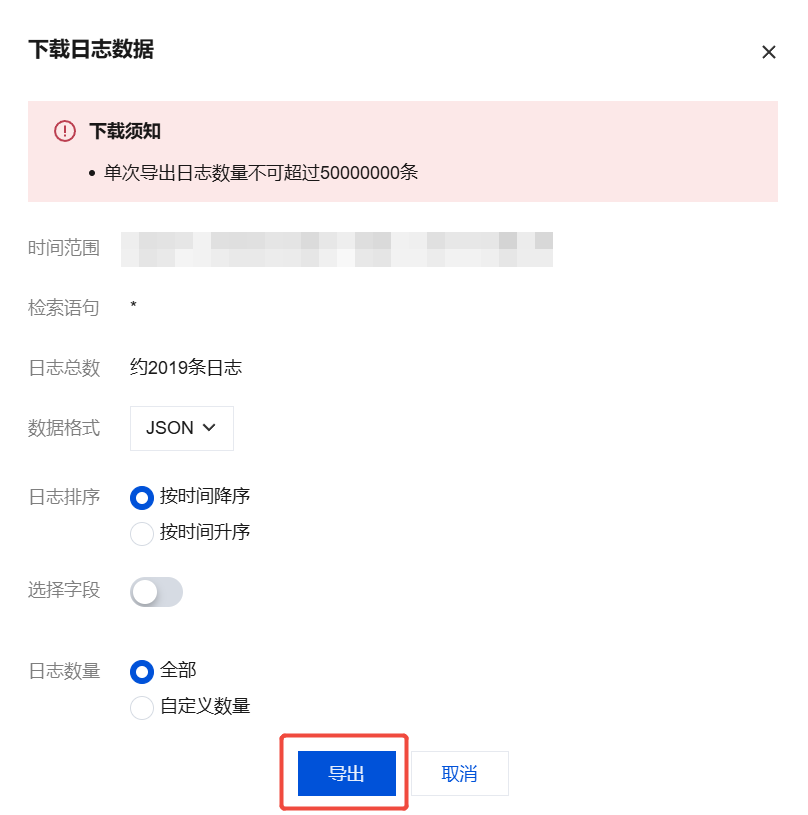 默认下载当前检索的日志范围。