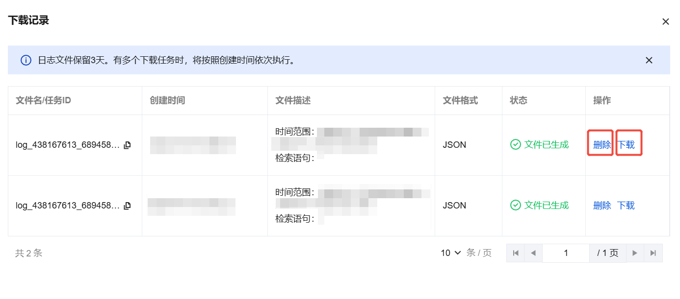 创建成功的日志下载任务,保留3天,超过3天之后日志文件将会删除,请及时下载。