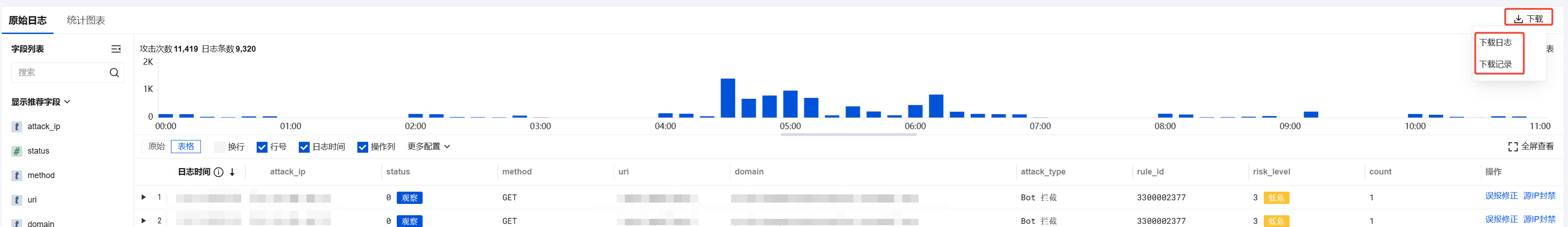 2. 在攻击日志页面,单击日志服务 > 原始日志