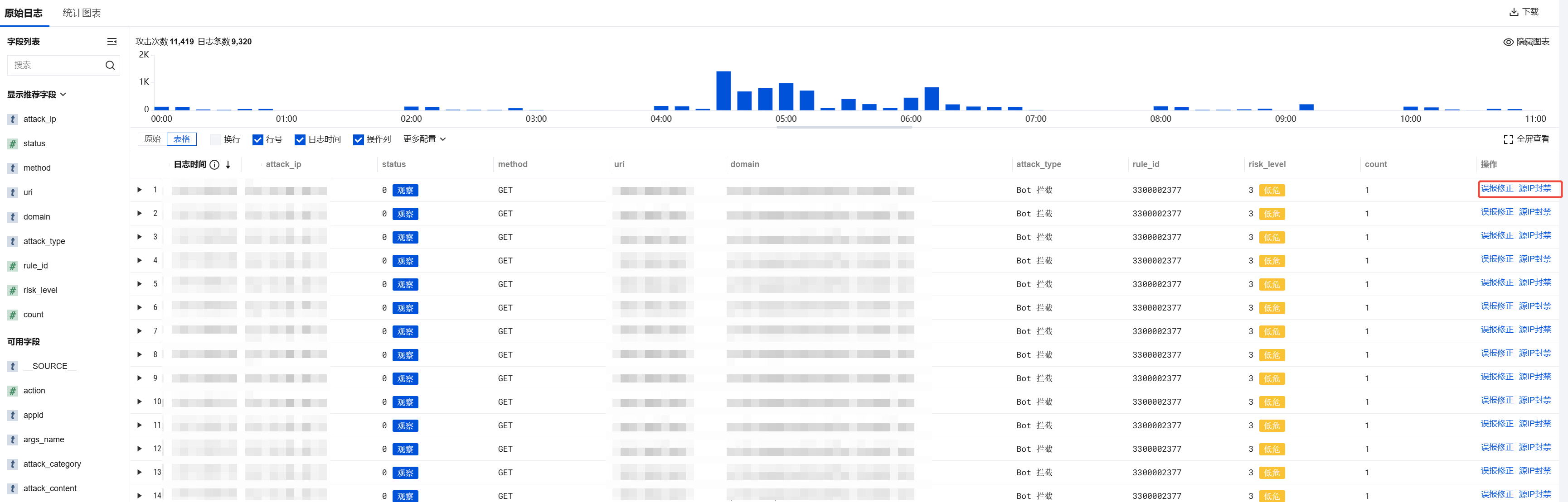 在攻击日志数据列表中,支持单击操作列中的误报修正源 IP 封禁,快速添加处置规则。