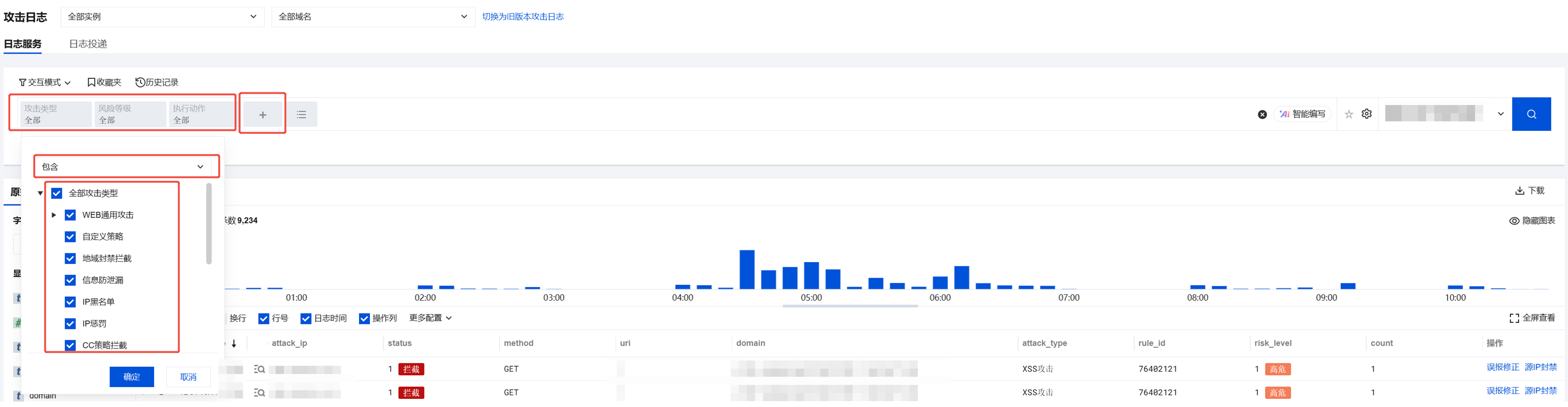 3. 检索攻击日志前,请先设置检索的范围。选择实例和域名,设置时间范围,单击
