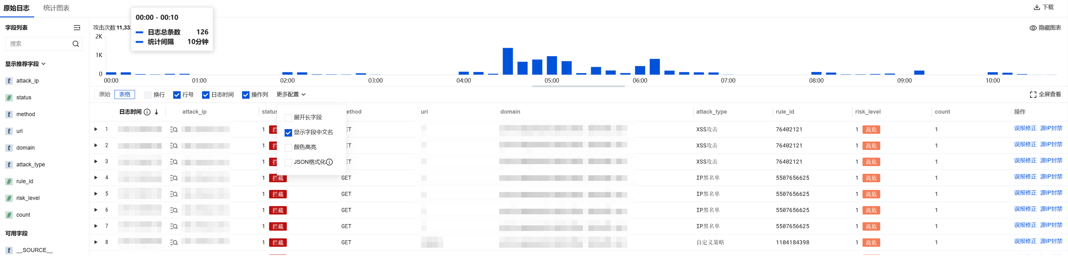在攻击日志数据列表中,单击每条展示日志发生时间左侧的