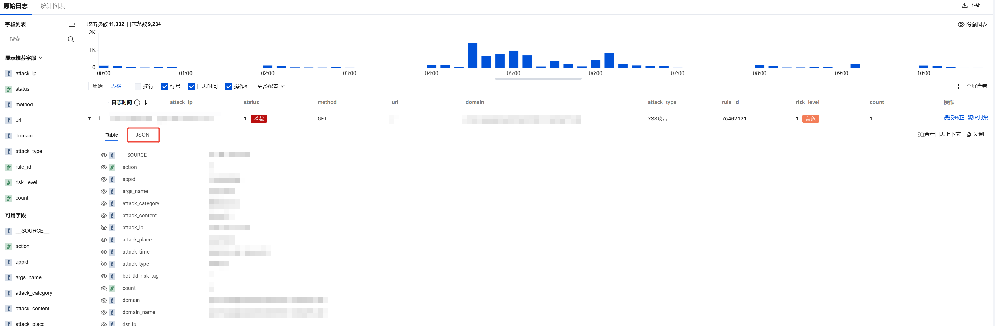,可以查看字段详情;单击 JSON,可以查看 JSON 格式的字段详情。日志详情字段说明请参考 日志详情字段说明