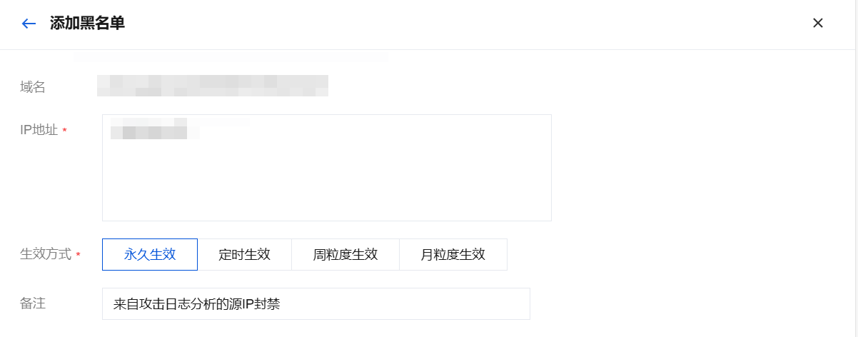 源 IP 封禁:支持一键添加 IP 黑名单,拦截对应 IP 的访问,完成修改后,单击确定