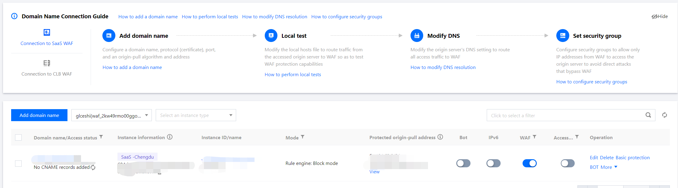This document describes how to connect a domain name to SaaS WAF. Before using WAF to protect your web business, you need to connect the website to WAF; otherwise, WAF protection cannot take effect.