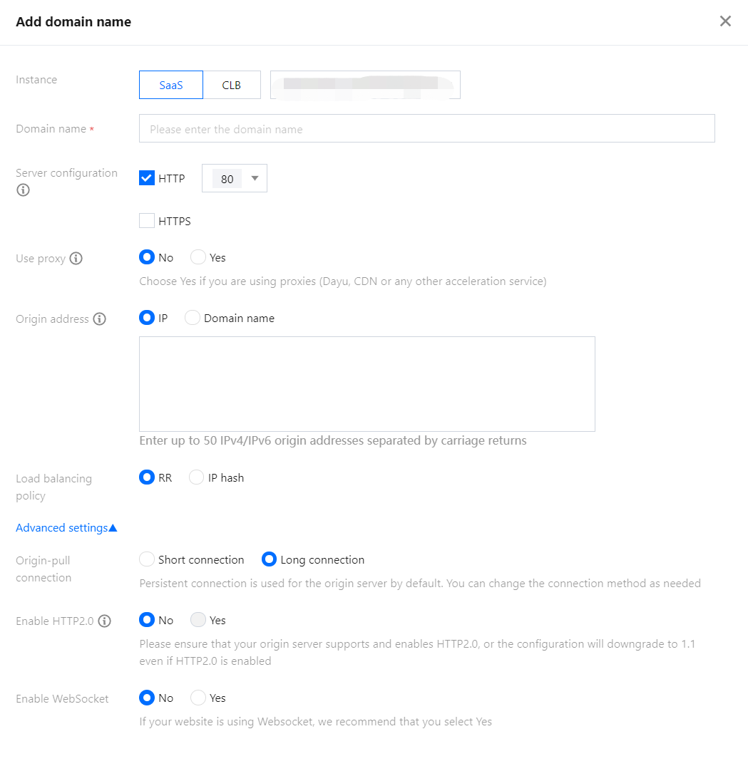 Domain name: Enter the origin domain name. Note that it must be different from the protected domain name.