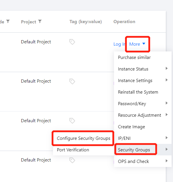 Alternatively, you can go to the CVM instance list page to view or modify the security group bound to a CVM instance. On the list page, select the ID of the CVM instance whose security group you want to adjust and click More > Security Groups > Configure Security Groups in the Operation column on the right for configuration.