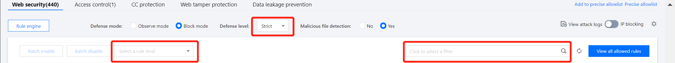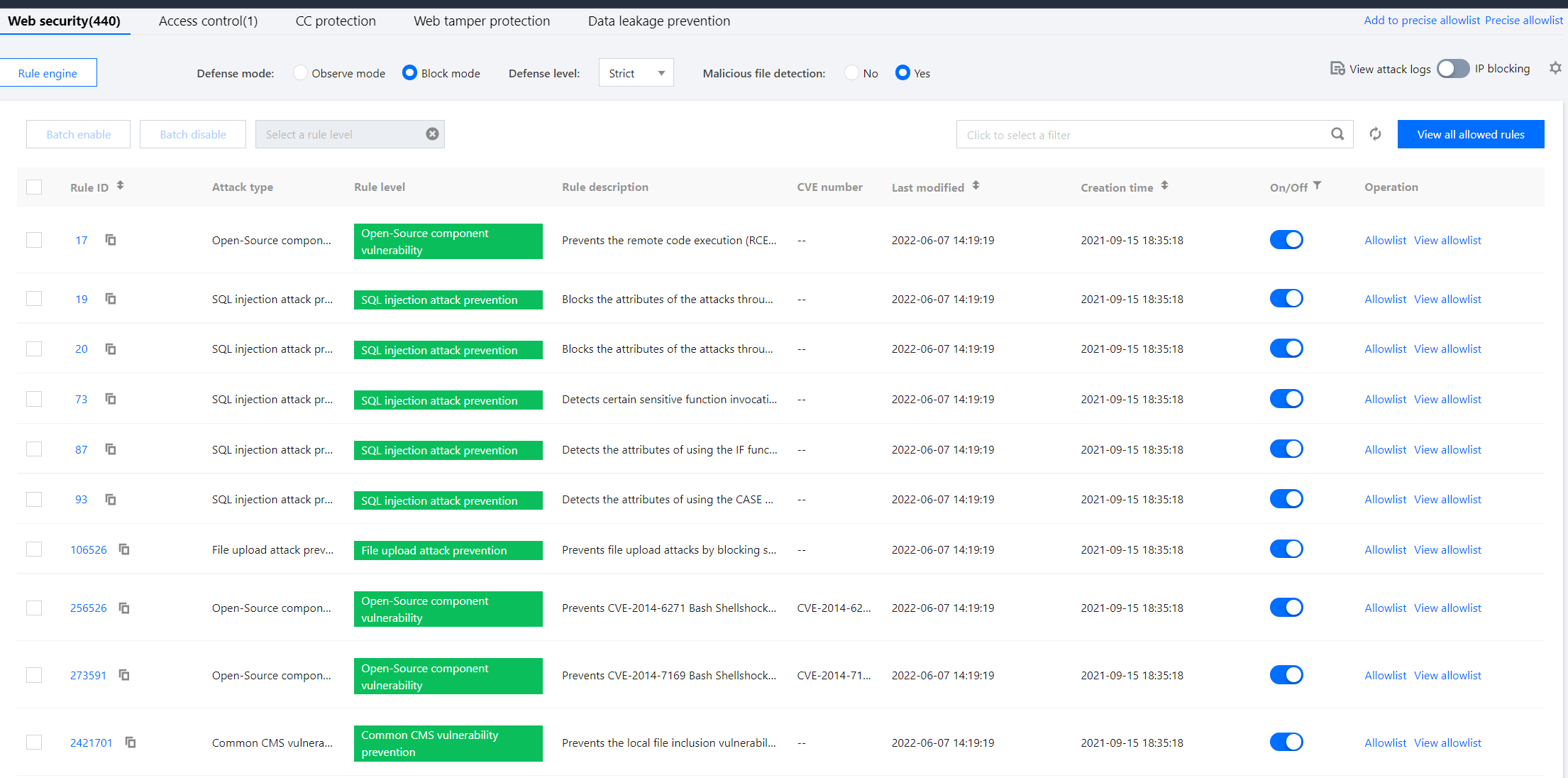 WAF's rule protection engine supports rule level configuration. You can set the rule protection level according to your actual business needs and enable or disable rule sets, individual rules, and preset rules. You can also use the allowlist of specified URLs and rule IDs to process false positives.