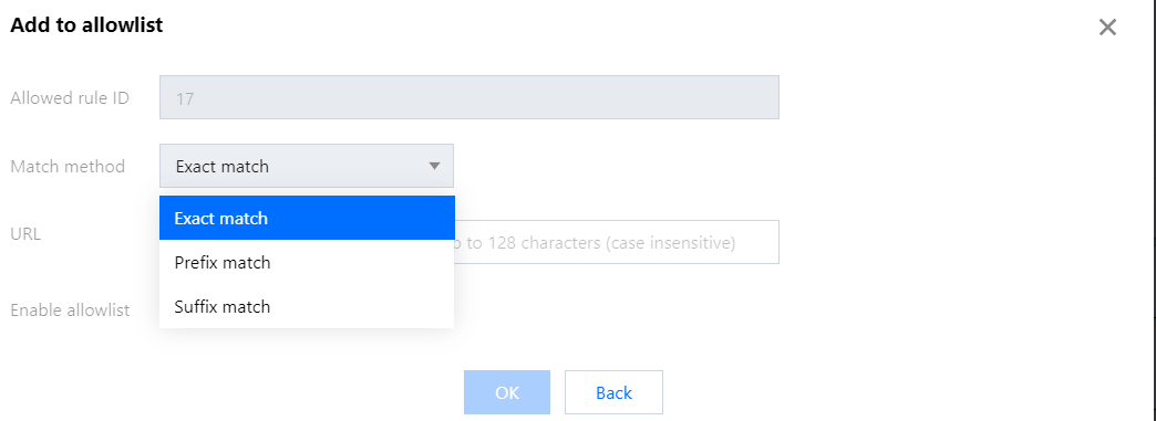 Match method: Match method of the URL to be allowed. You can select "Exact match" (default value), "Prefix match", or "Suffix match".