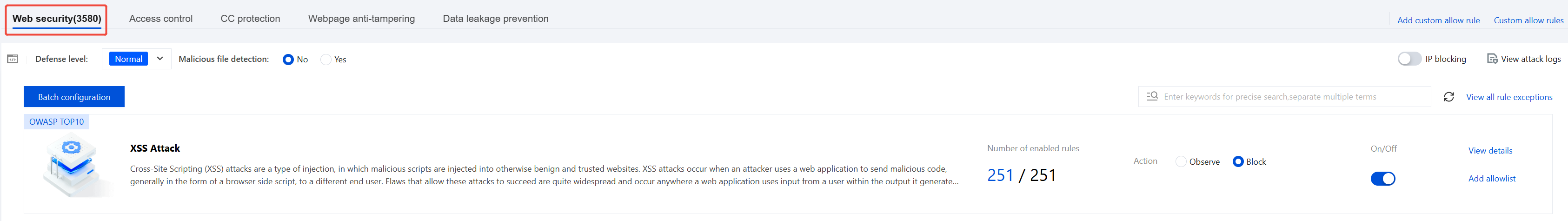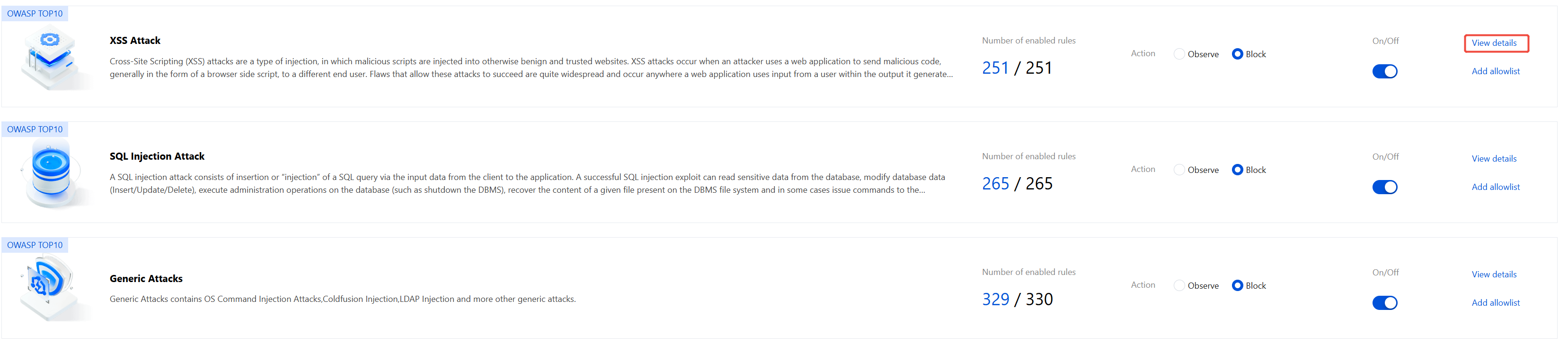 5. In addition to the above methods, you can click View Details on the right of an attack type. On the ruleset information page, click Allowlist in the Operation column to add an allowlist rule.