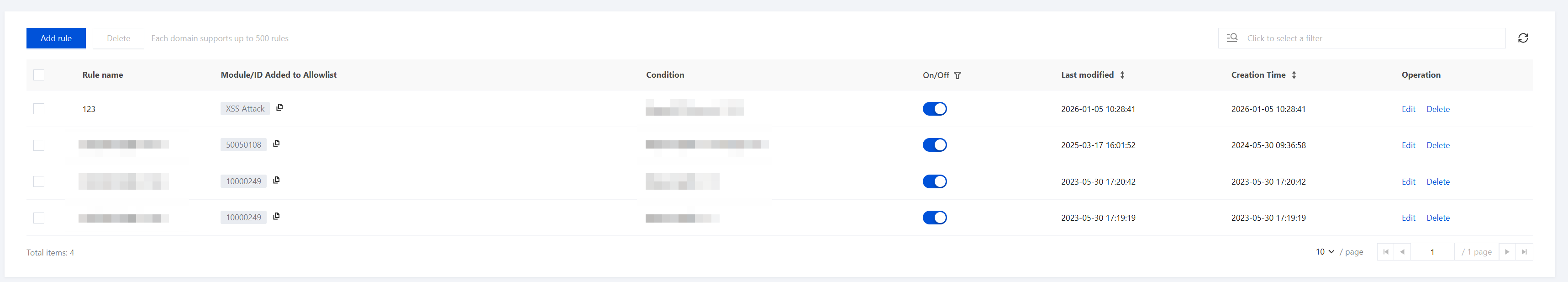 6. Once the allowlist is added, you can view the allowlist rules on the rule allowlist page and perform related operations. You can enable or disable allowlist rules in the rule switch column, edit or delete them in the operation column, and support batch deletion of rules.