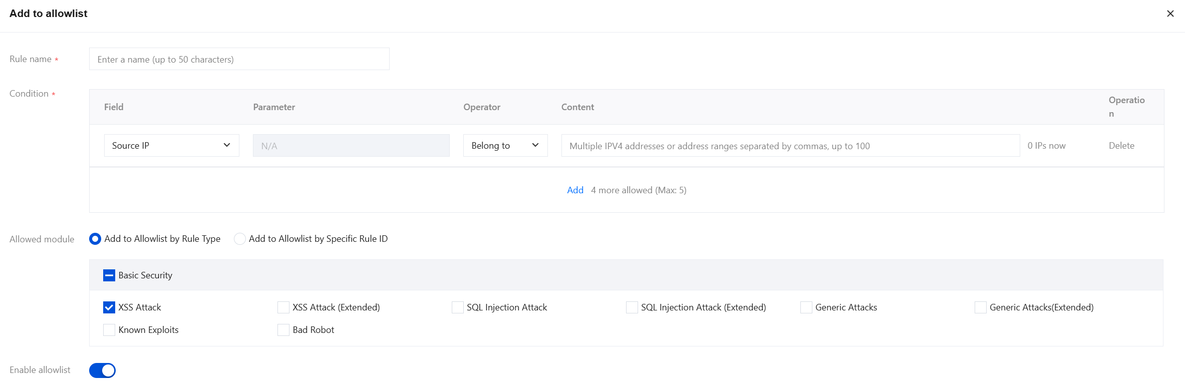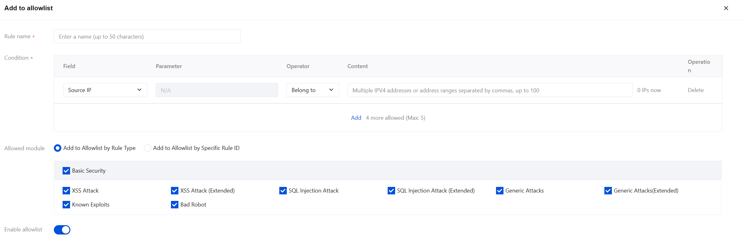 4. Click Add allowlist on the right of the attack type ruleset to navigate to the Add Allowlist page. On this page, configure relevant parameters and click OK.