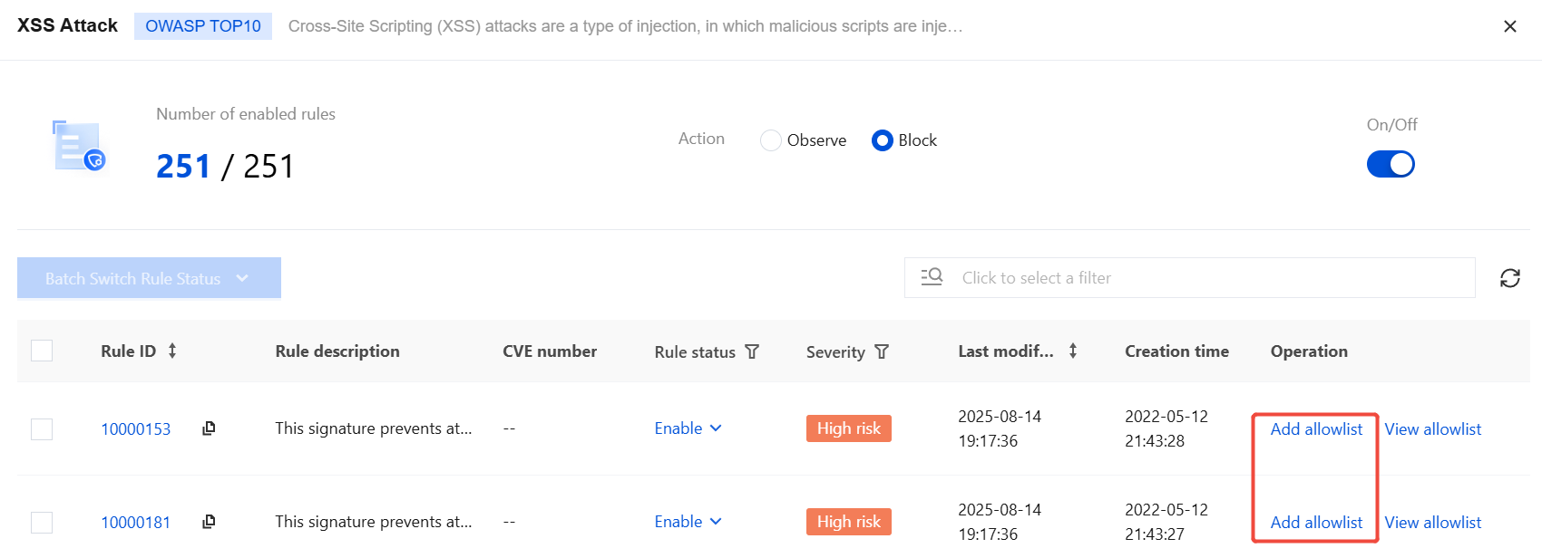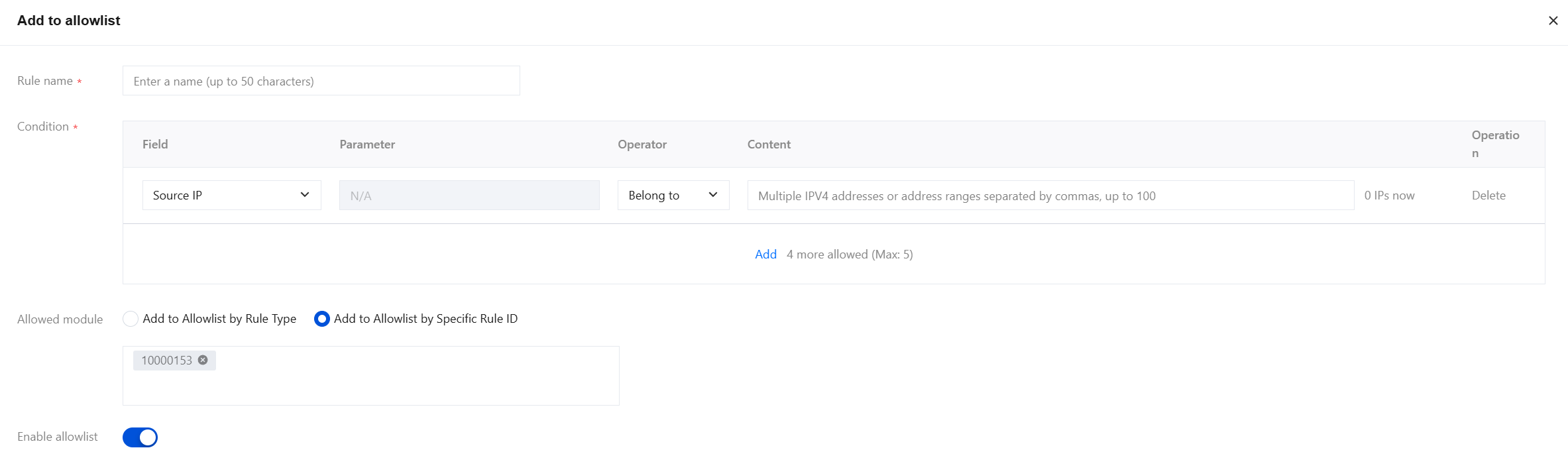 Enable allowlist: One-click enable/disable of this allowlist rule is supported.