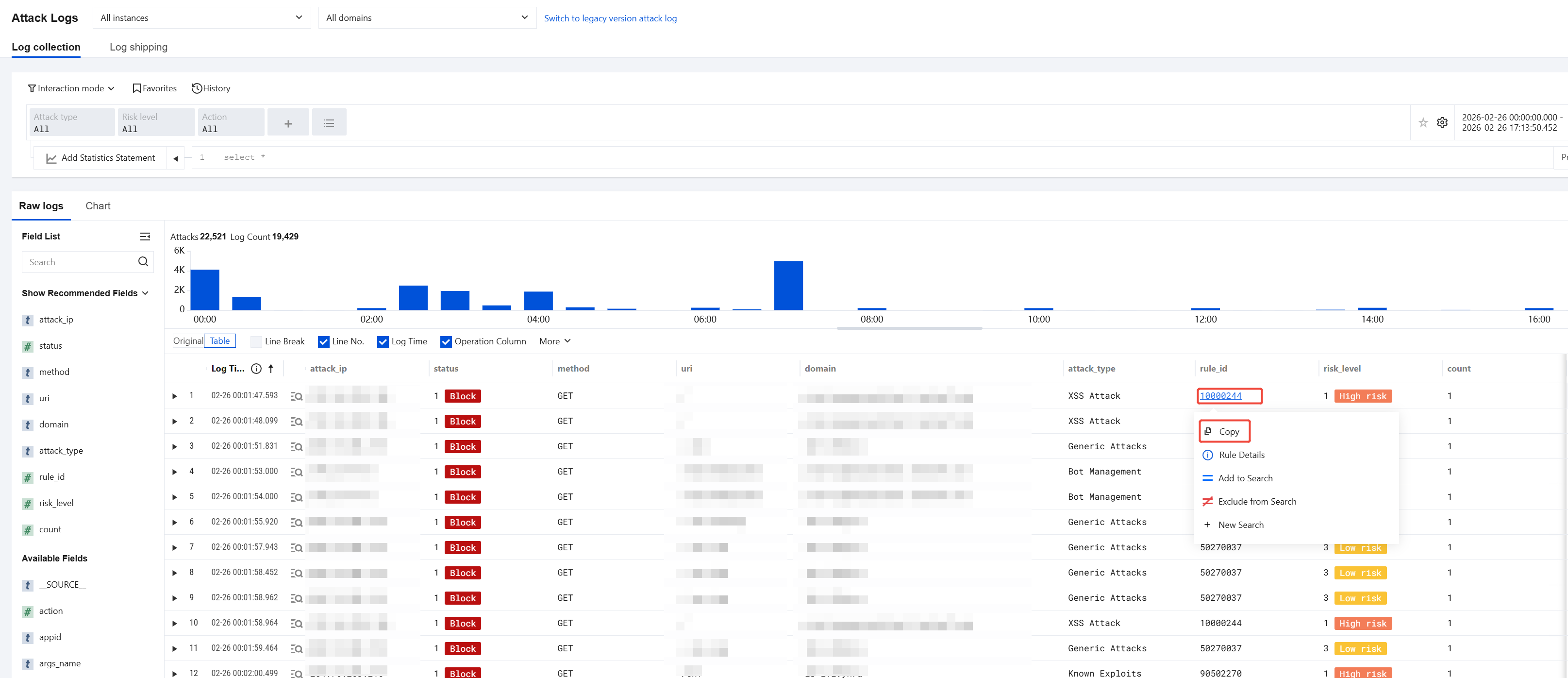 a. On the Basic Security > WEB Security page, select the attack type ruleset to which the required rule ID belongs, and click View Details. b. Select the required rule ID and click . Method 2: On the Attack Logs > Log collection > Raw logs page, click the desired rule_id and select Copy. Blocklist/Allowlist