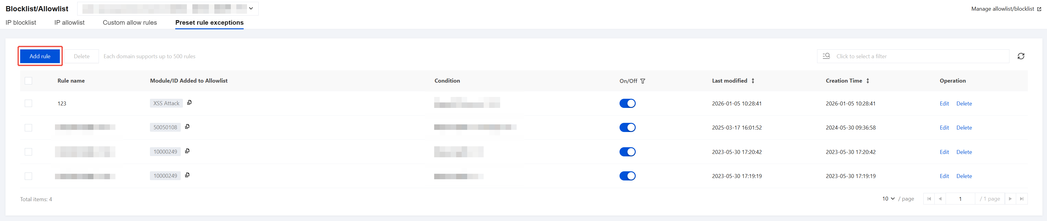 4. On the Preset rule exceptions page, click Add rule, and an Add to allowlist pop-up window will appear.
