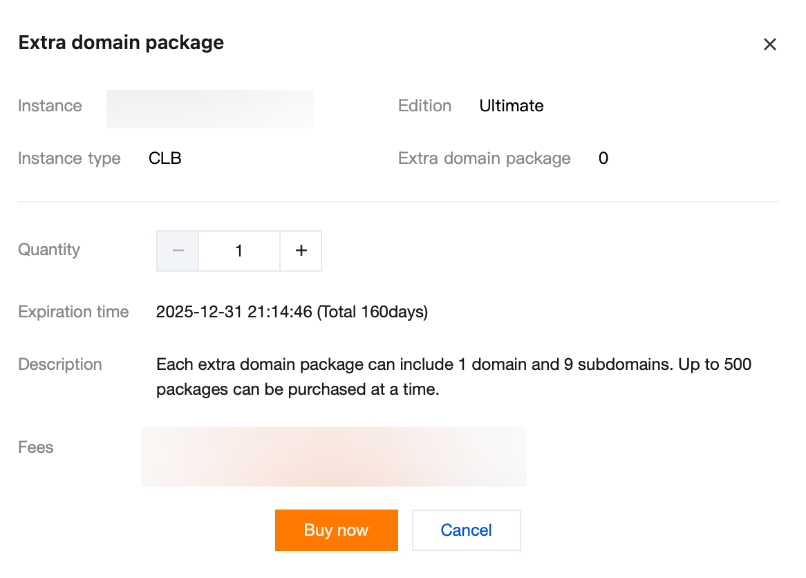 Purchase extra domain package: Select purchase quantity (1-500), click Buy Now to purchase the extra domain package.