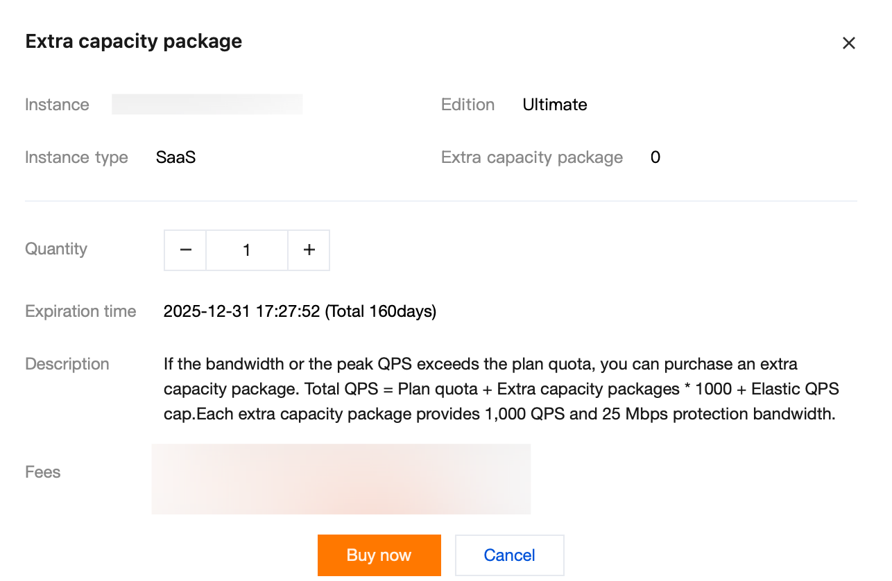 Purchase extra capacity package: Select purchase quantity (1-500), click Buy Now to purchase the extra capacity package.