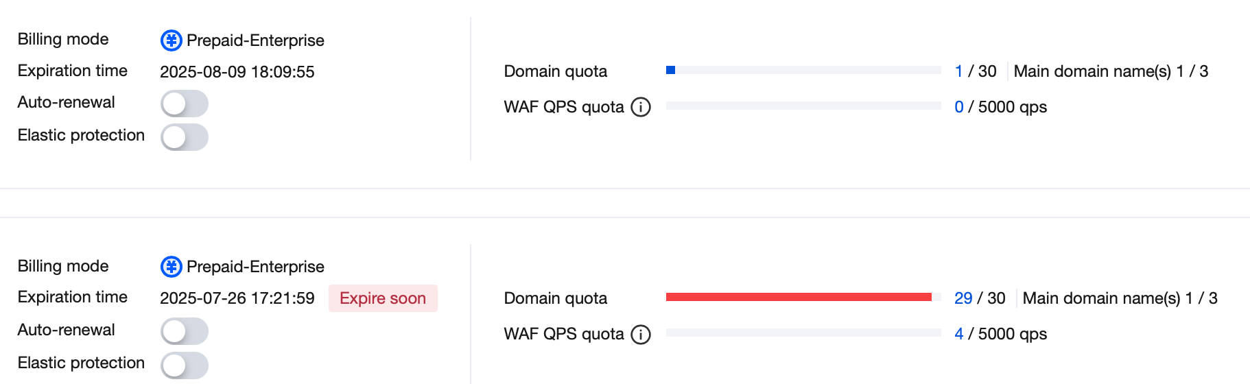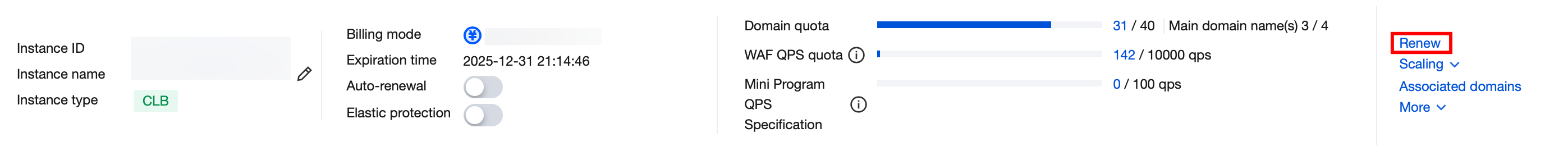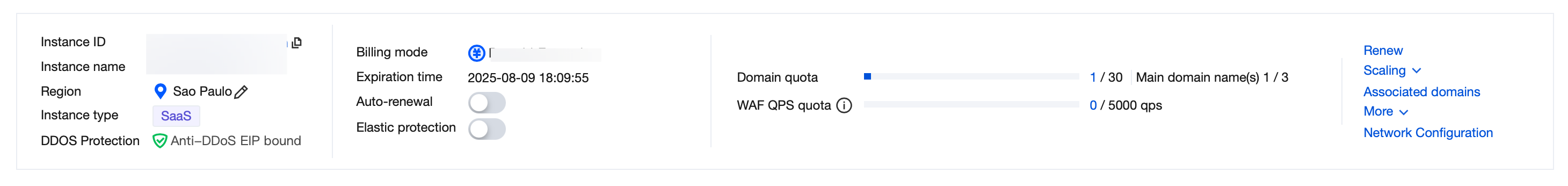 After searching for the required instance and viewing it, you can check the expiry time of your purchased product package and the remaining usage of the expansion package on the instance management page dashboard. 1. If your package is about to expire and needs renewal, click Renew. On the WAF package renewal webpage, select a renewal duration and click Renew Now to renew your current package.