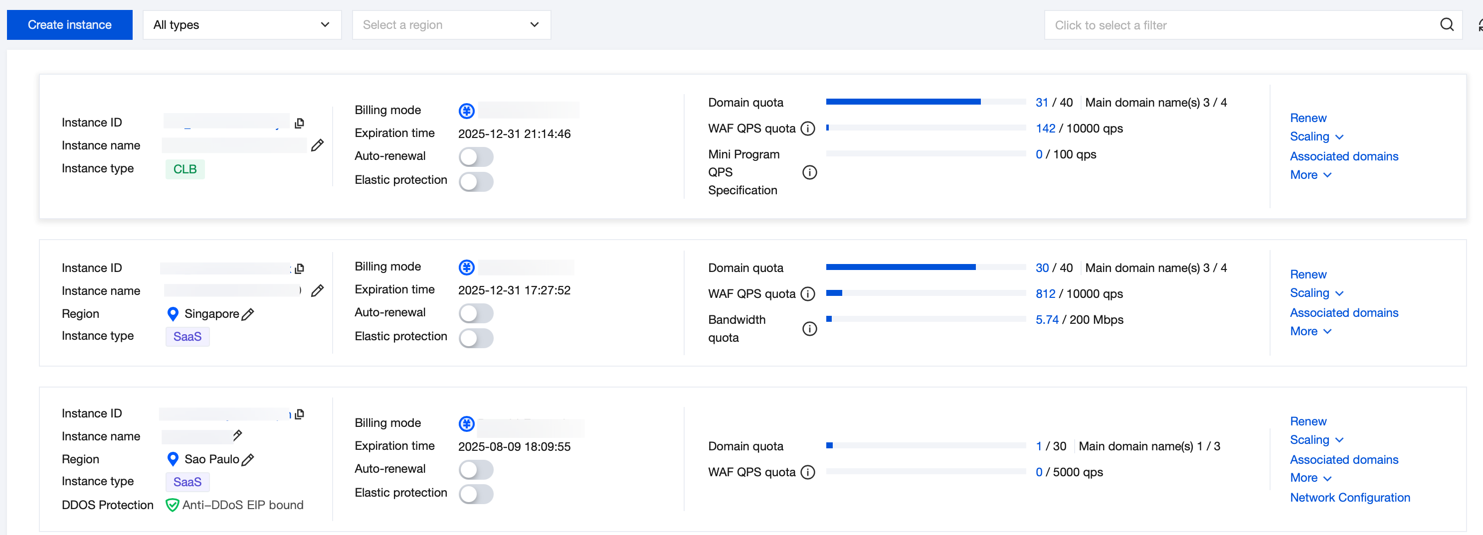 1. Log in to the WAF console, select Connection Management > Instance Management in the left navigation bar, and go to the instance management page. 2. On the instance management page, you can filter existing instances by type and region, or search for existing instances by keyword in the search bar using "Instance ID, instance name, and billing mode".
