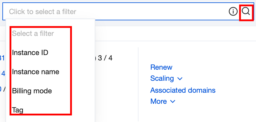 Click the search box to query existing instances by keyword such as "Instance ID, instance name, billing mode and tag".