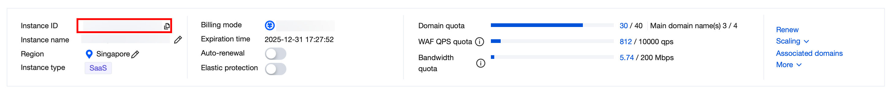 5. On the instance detail page (the following introduction is based on a SaaS instance as an example), you can view the basic information, plan information, extensions, add-ons, value-added capability, and attack log shipping info of the instance.