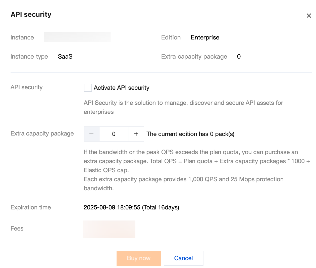 API Security: Choose whether to activate API security and purchase extra capacity package as needed, click Buy Now to purchase related services.