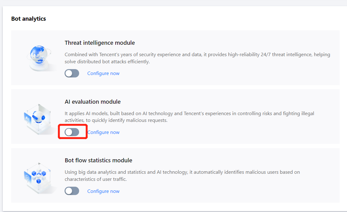 This document describes the AI policy module in bot traffic management. This feature is built on Tencent's nearly 20 years of experience in cybersecurity and bot defense. It applies AI models, built based on AI technology and Tencent's experiences in controlling risks and fighting illegal activities, to quickly identify malicious requests and fight against previous, APT, and distributed bots.