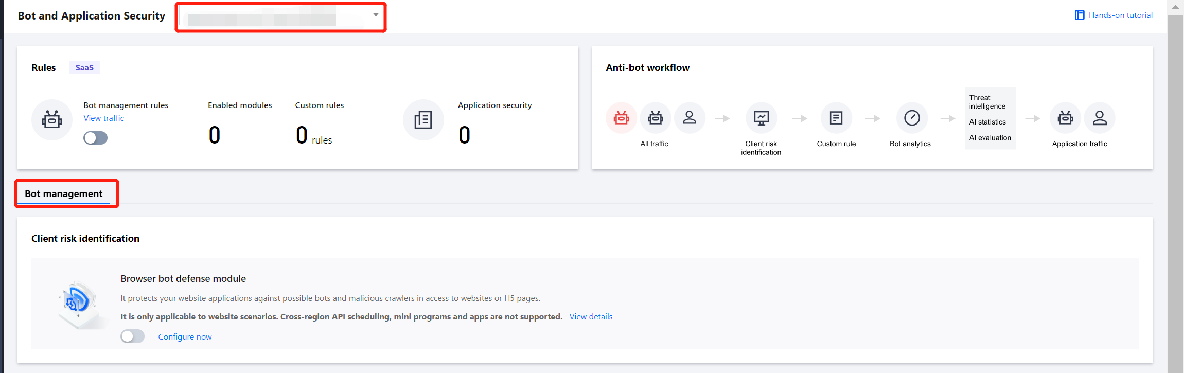 1. Log in to the WAF console and select Configuration center > Bot and application security on the left sidebar. 2. On the Bot and application security page, select the target domain name in the top-left corner and click Bot management.