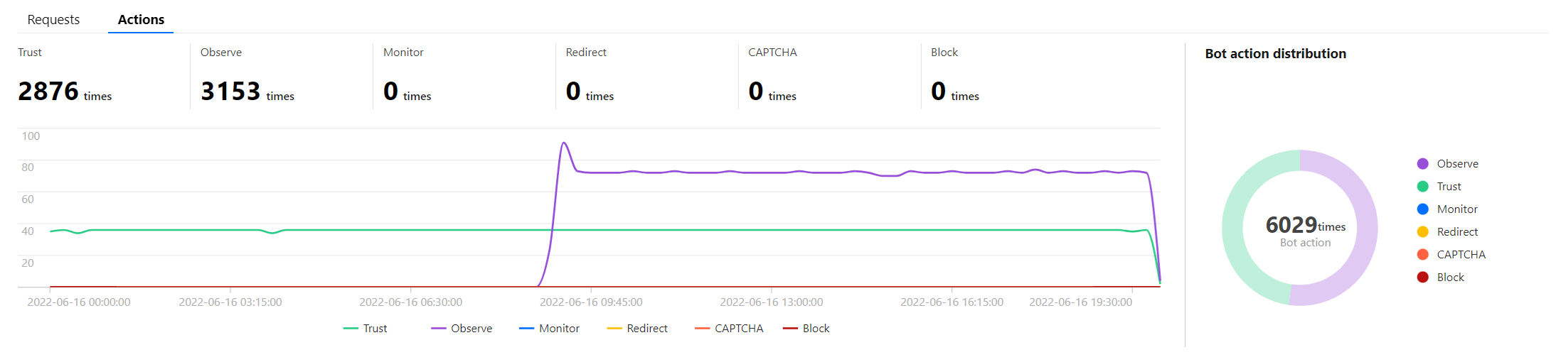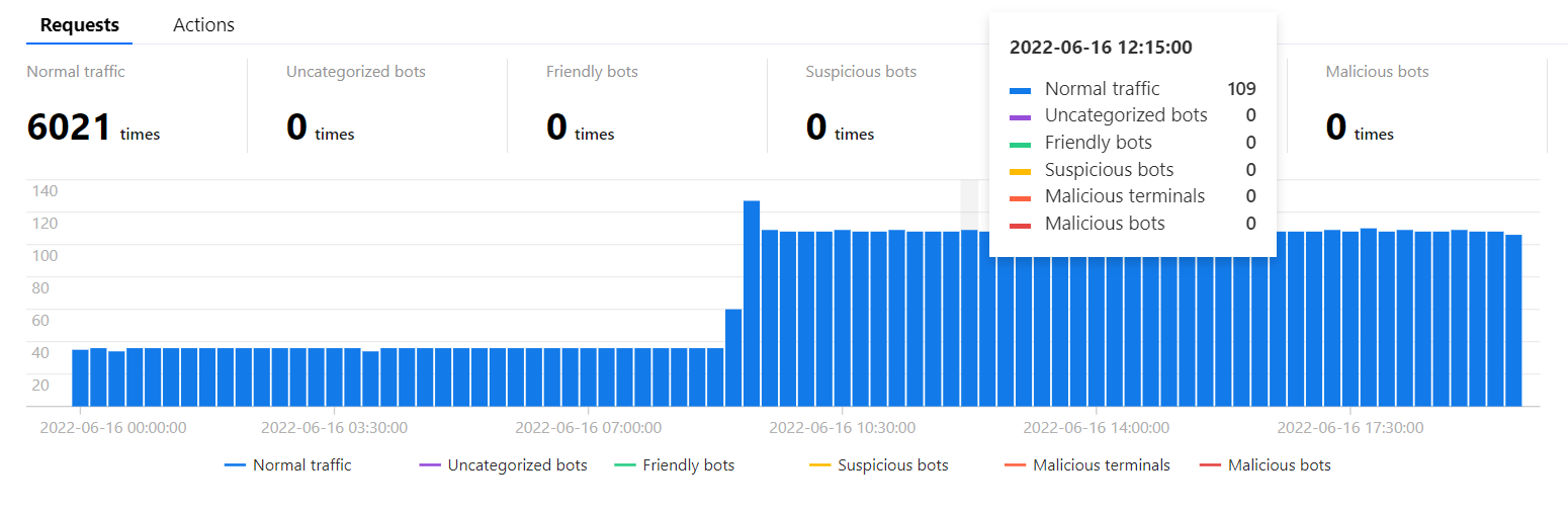 Bot requests chart: Group different bot scores into different ranges according to the configured action and tag, score and tag each traffic request accessing the website, and display the result on the chart.