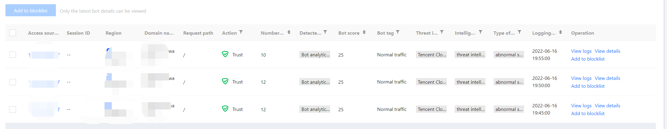 5. In the Requests section, you can view the bot requests and bot session scores of the current domain name (you can select a global domain name).