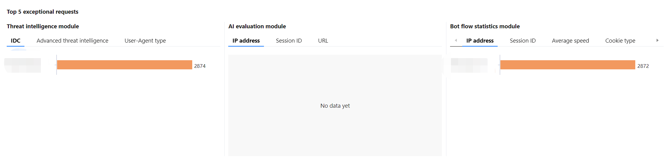 Analysis of hits: Displays the exceptions in the current access request that hit the bot analytics module in the aggregated dimension.
