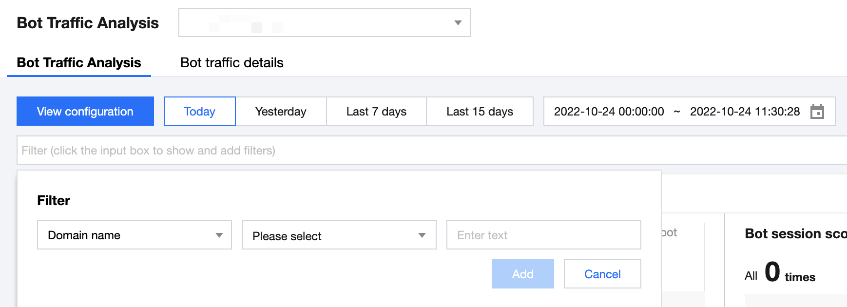 4. On the Bot traffic analysis page, search for the protection data of a domain name by Time or Filter.