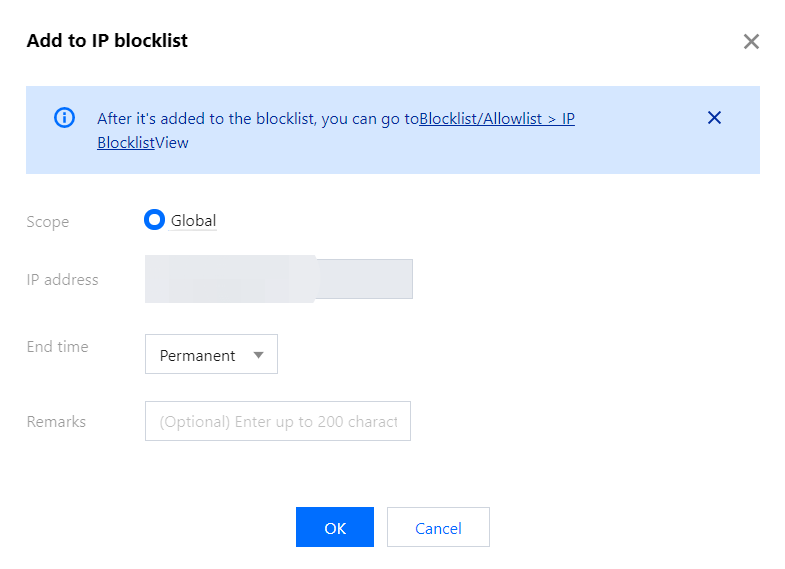 Add to blocklist: Click Add to blocklist, configure parameters, and click OK.
