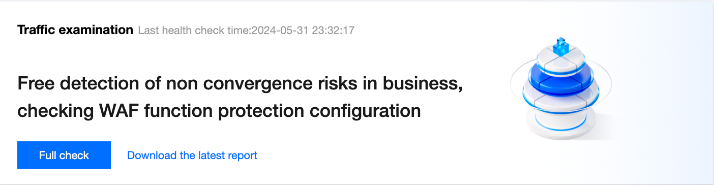 1. Log in to the WAF console, and choose Traffic Inspection in the left sidebar. 2. On the traffic Inspection page, you can initiate a check, view the top 5 key issues of concern, and download historical check reports.