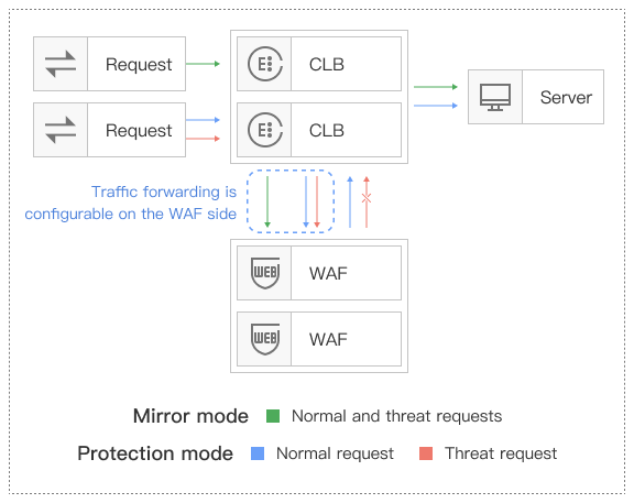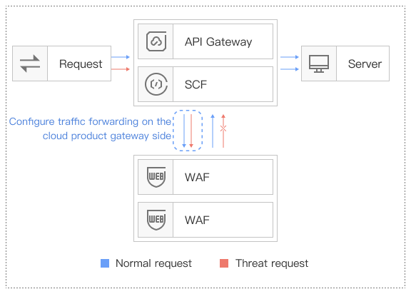 Suitable for Cloud Function (SCF) users, such as serverless web applications, event-driven business protection. | Supports protection mode. Separation of forwarding and protection, more reliable with Cloud Function controlling traffic access. | Connect via SCF trigger and WAF interaction. Flow details on the SCF side can be found in the Cloud Function product documentation. | Hong Kong Special Administrative Region 、Virginia、Siliconvalley、SaoPaulo、Frankfurt、Seoul、Mumbai、Tokyo、Singapore、Bangkok | |
