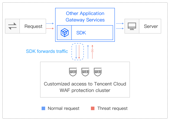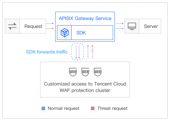 Suitable for APISIX gateway users who want to combine Tencent Cloud WAF for enhanced security protection. | Compatible with the open-source ecosystem. Supports SDK plugin integration, autonomous and controllable. | Connect via SDK integration, forwarding business traffic to Tencent Cloud WAF cluster (custom integration required). | Custom access in Frankfurt and Singapore | |