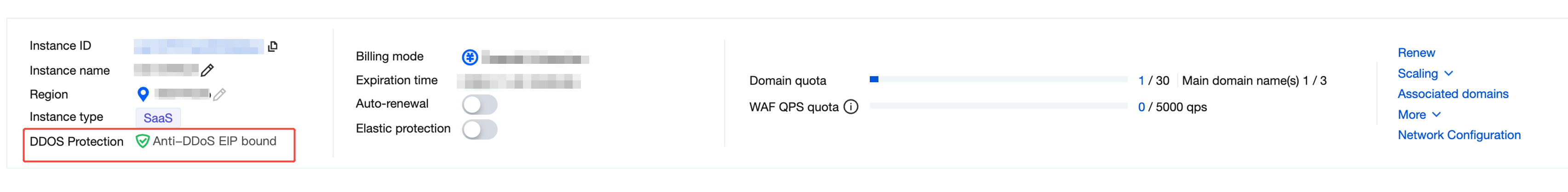If the instance is bound to a High-Defense EIP, ​DDoS Protection Status​ below the instance type will display ​High-Defense EIP Bound.