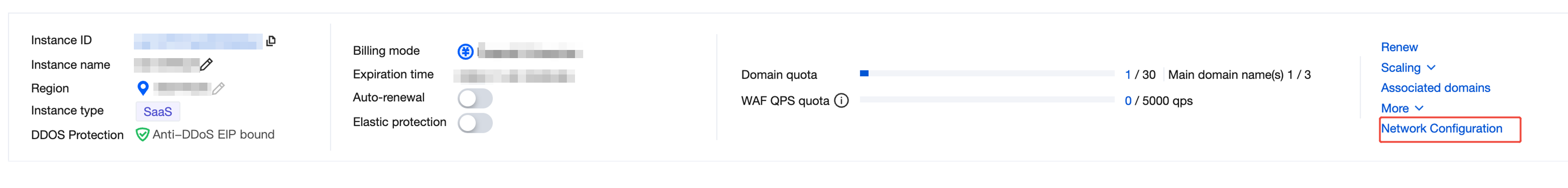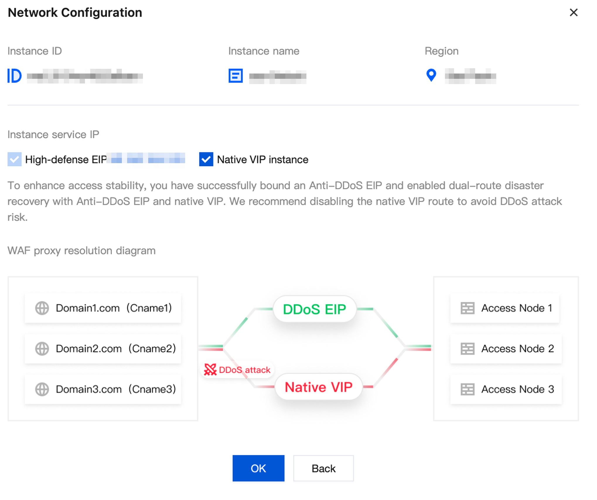 7. Click ​Network Configuration​ to open the Network Configuration popup. By default, WAF enables dual-line disaster recovery for both the High-Defense EIP and the native VIP. Here, you can disable the native VIP line to avoid exposing DDoS attack risks.