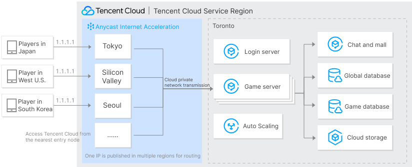 An Anycast IP can be used for gaming acceleration. Through AIA, game requests can access Tencent Cloud from nearby entries and get to game servers through Tencent Cloud's private network, greatly shortening the public network path and reducing problems such as latency, network jitter, and packet loss. Compared with the traditional acceleration service, an Anycast IP requires no extra deployment of traffic receivers at the entry and eliminates the need for zoning, thus simplifying DNS deployment.