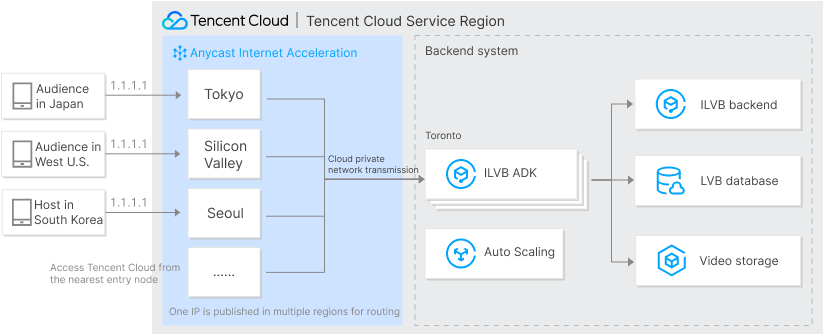If high-quality and latency-free audio/video streaming is desired during live video broadcasting (LVB) in the case of cross-region transmission, the LVB platform needs to establish the dedicated network and access points that cover multiple regions. With the aid of AIA, the LVB platform can directly use Tencent Cloud's private network and POPs to serve users, without the need to set up a dedicated network connection from scratch.