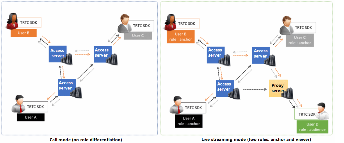 The call modes allow a maximum of 300 users in each TRTC room, and up to 50 of them can speak at the same time. The call modes are suitable for scenarios such as one-to-one video calls, video conferencing with up to 300 participants, online medical consultation, remote interviews, video customer service, and online Werewolf playing.