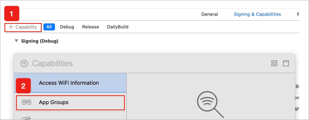 4. Select the newly added Target, click sequentially + Capability, double-click App Groups, as shown in the figure below: