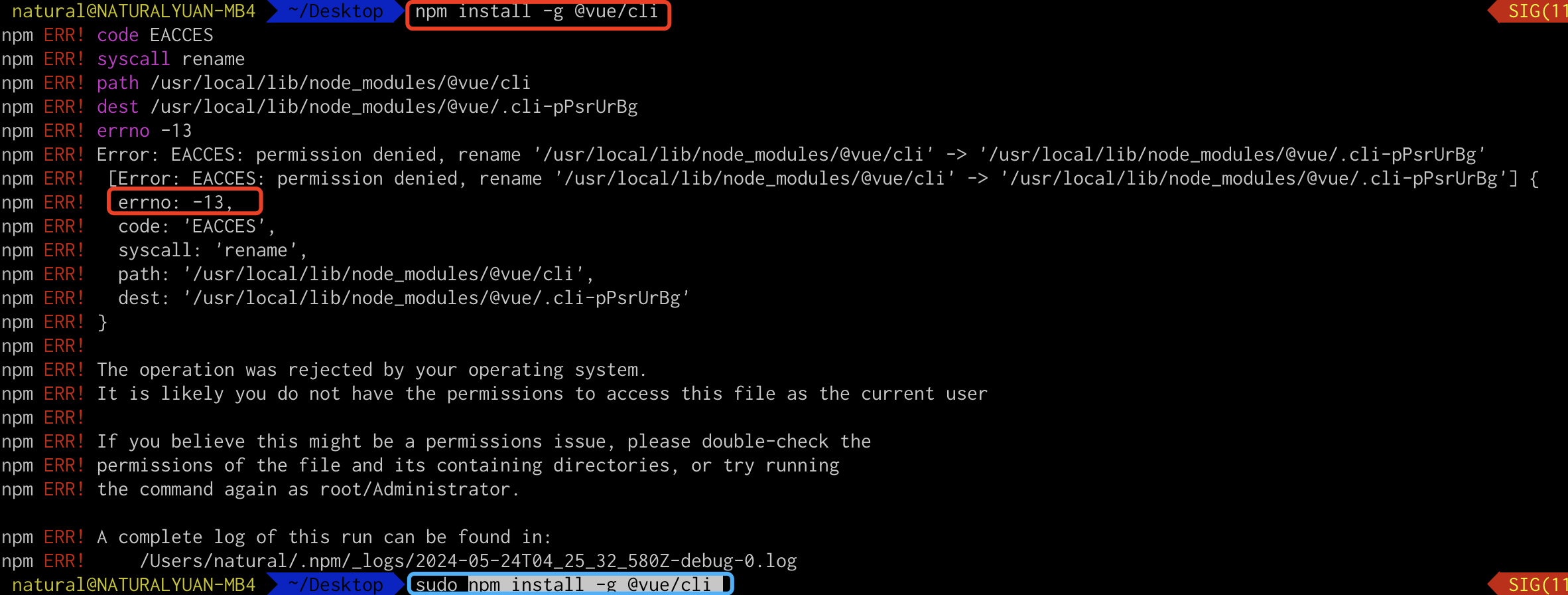If this error occurs, it is because the current user does not have permission to globally install scaffolding. Please use sudo npm install -g @vue/cli.