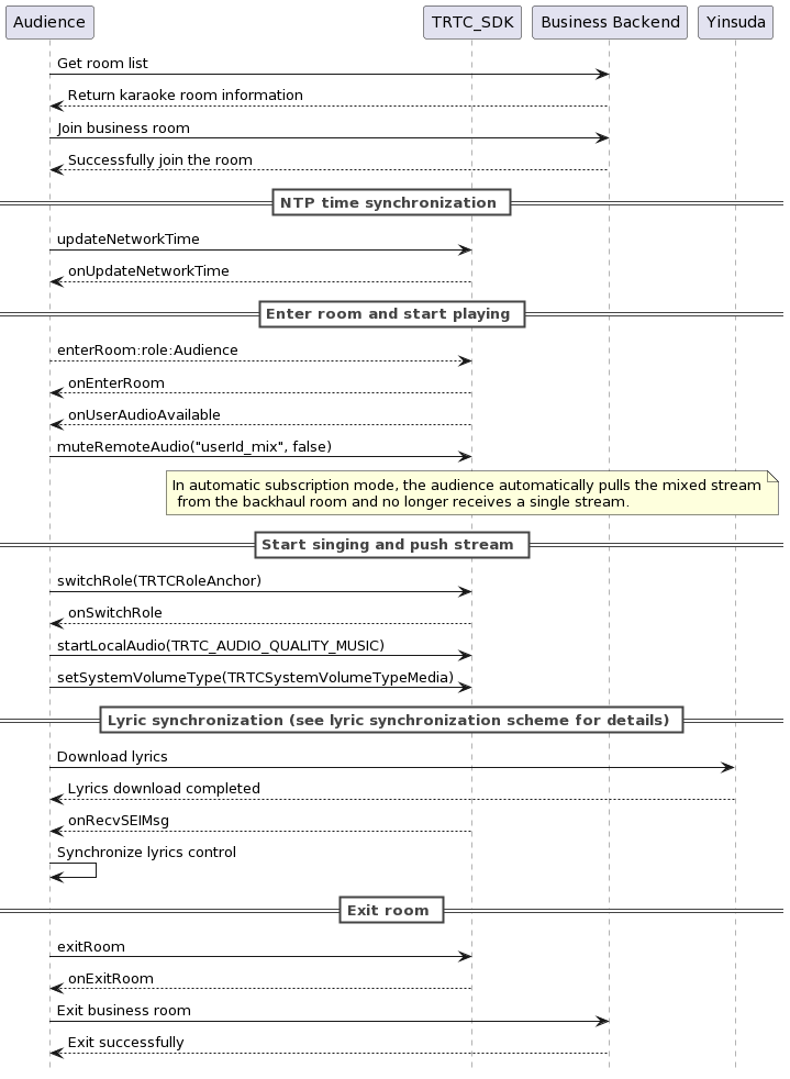 Audience | The audience in the Karaoke room plays the stream of the singer. | The role is an audience, but can also become a host by going on the seat Downstream audio and video streams Receive SEI information (receive lyric information) |