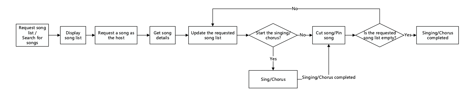 To implement a complete online Karaoke scenario, multiple functional modules are required, including room management, seat management, song selection management, and Karaoke management. The key actions and features of each functional module are shown in the table below. In the following sections, each functional module will be introduced in detail to provide a complete understanding of the required functions for building a Karaoke room.